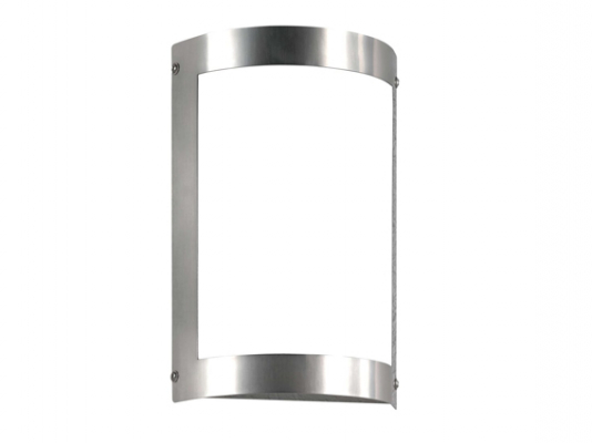 Schlicht gewölbte Außenwandleuchte kombiniert mit satiniertem Floatglas und feingebürstetem Edelstahl. Mit LED-Platine.
